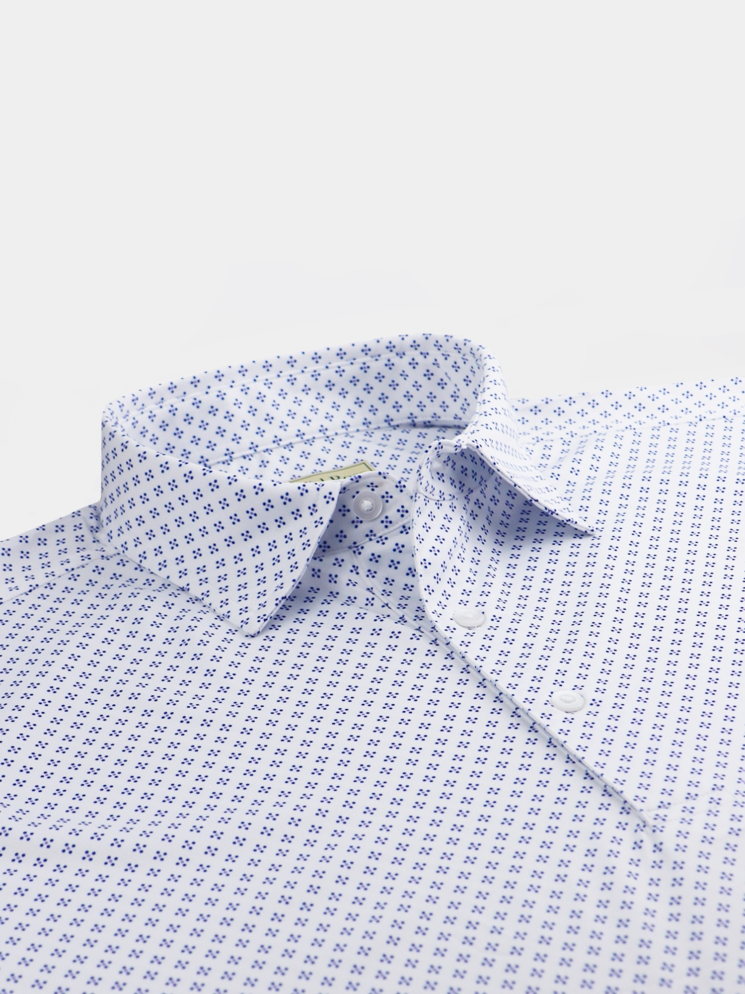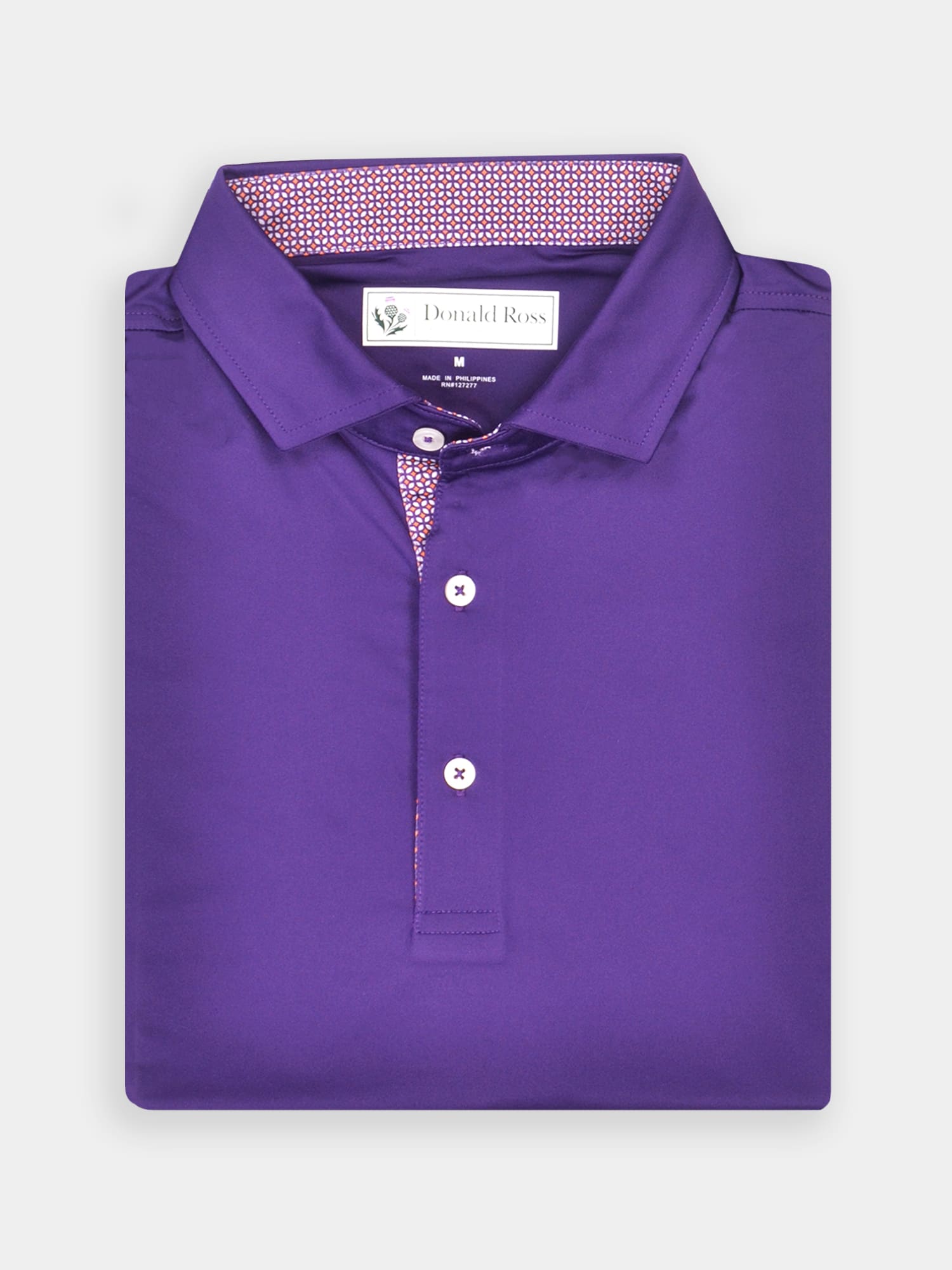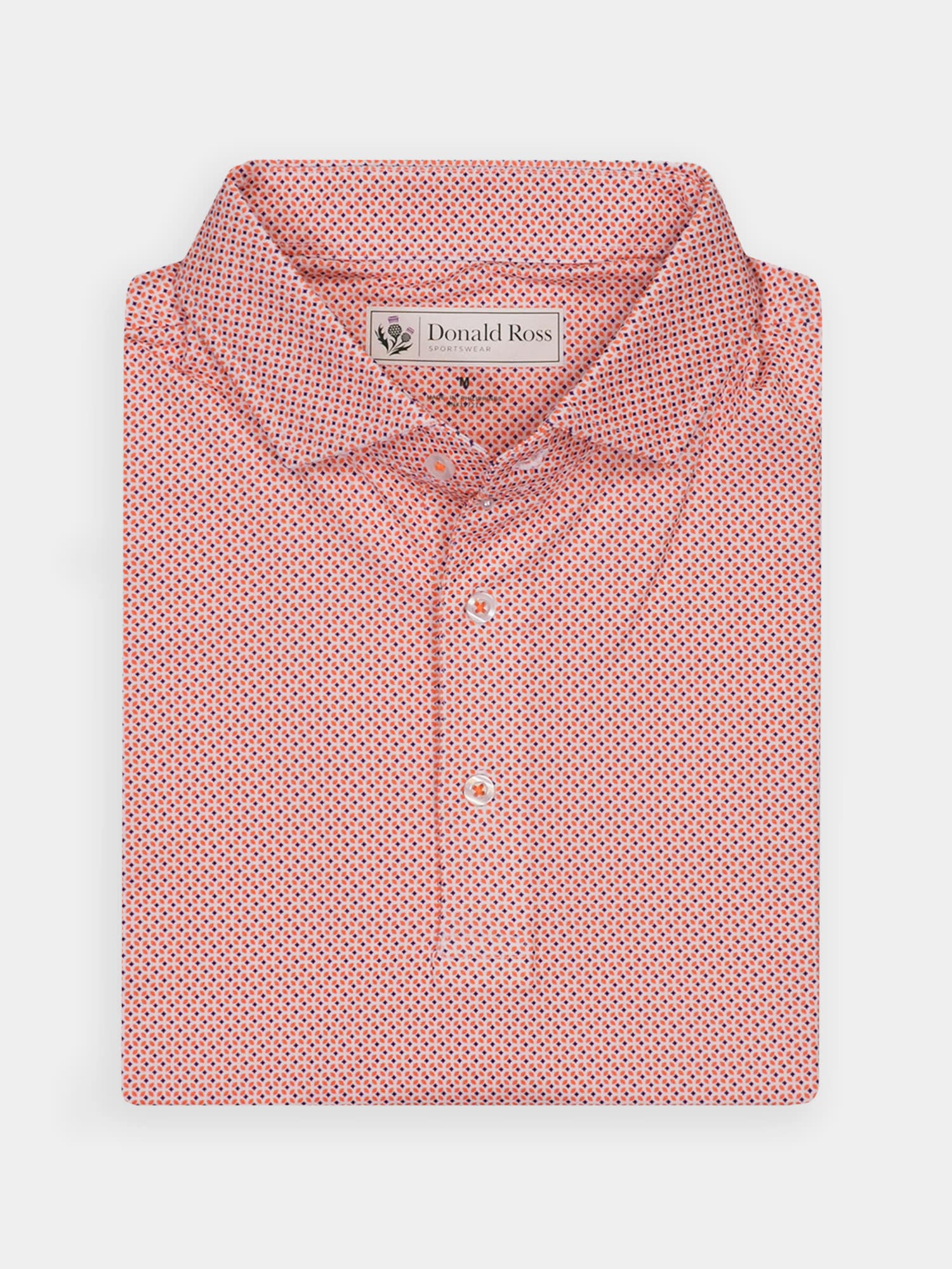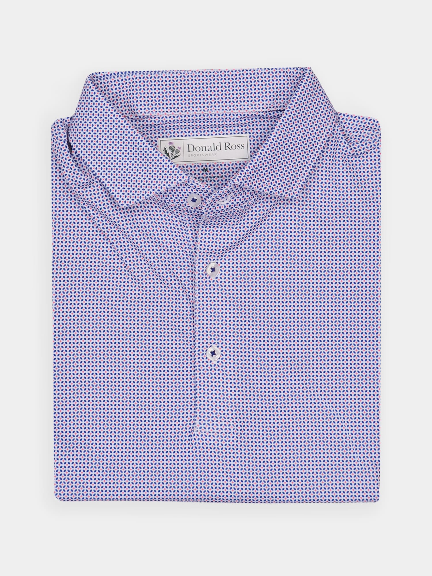 Short sleeve jersey featuring a neat foulard print with a classic three-button placket and self collar.