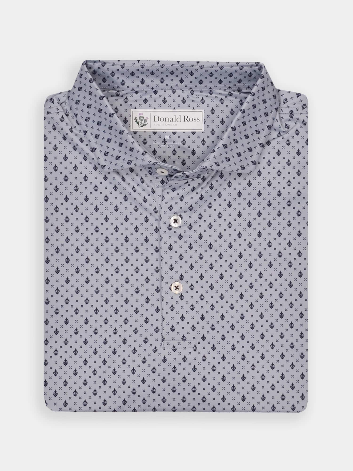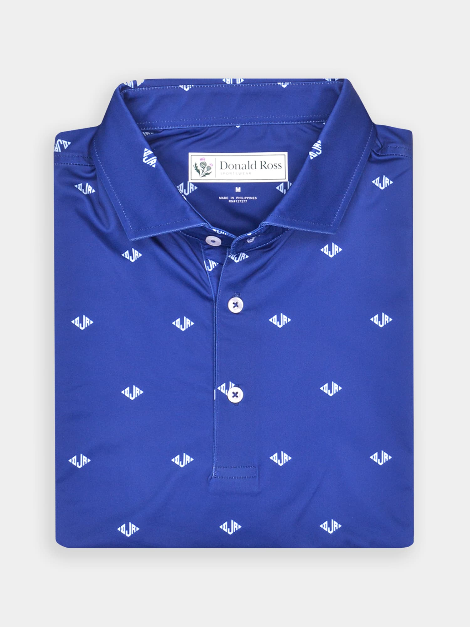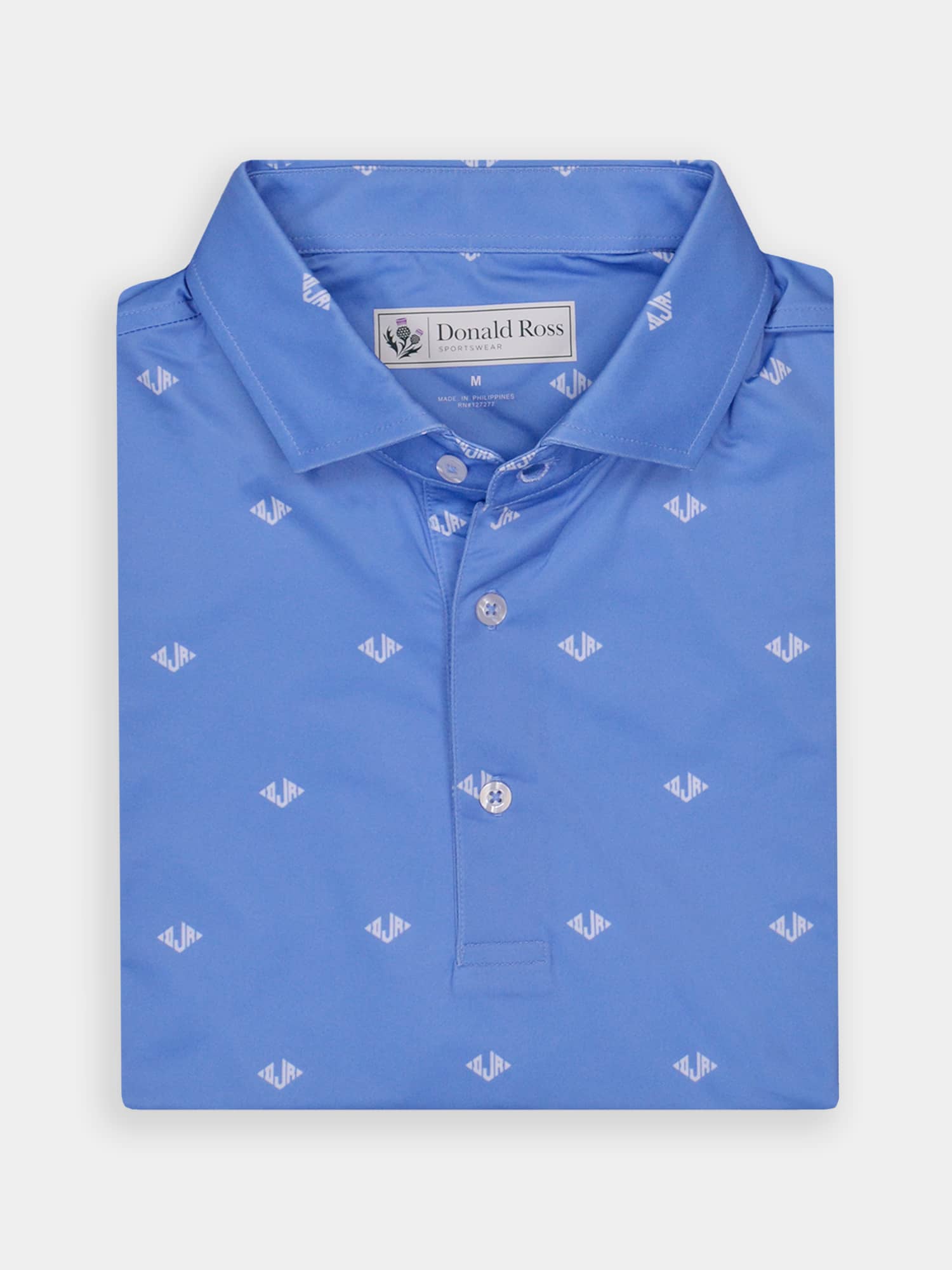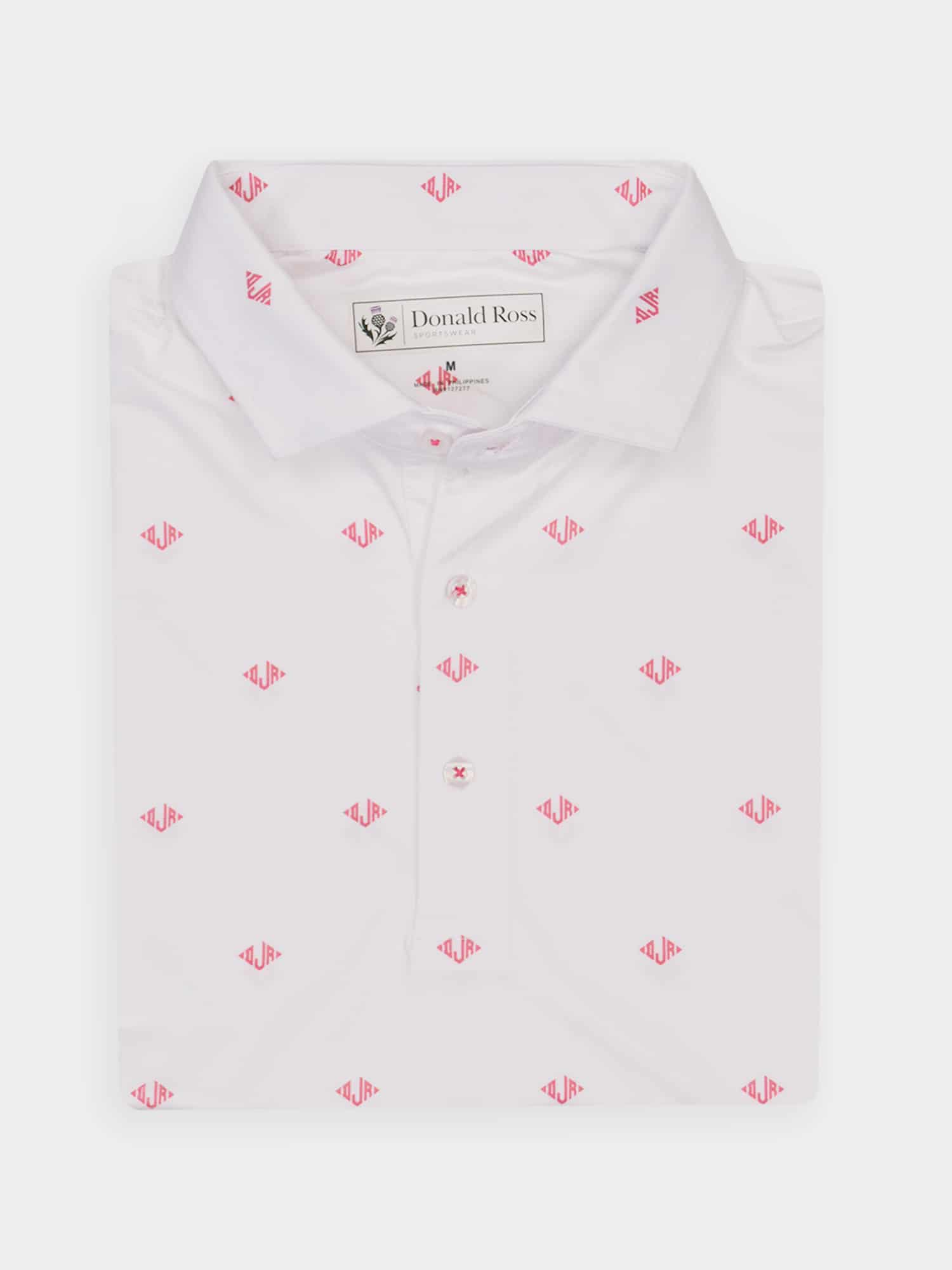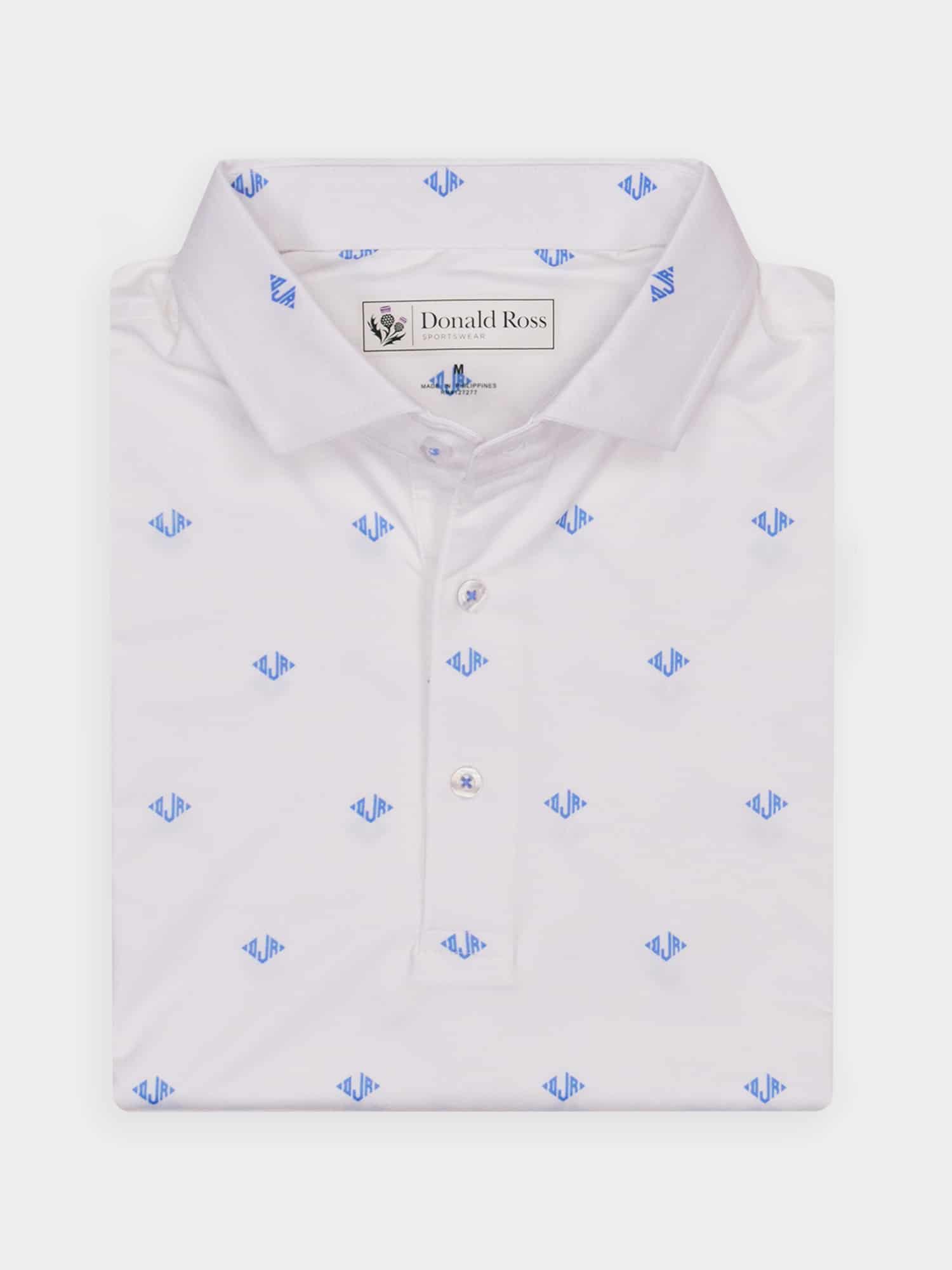 Short sleeve jersey featuring a DJR monogram print with a classic three-button placket and spread collar.