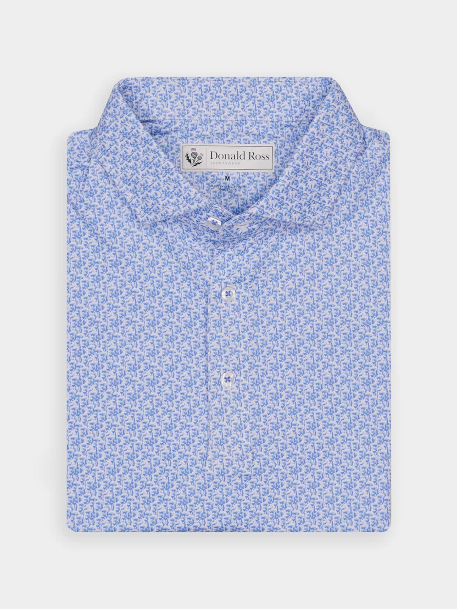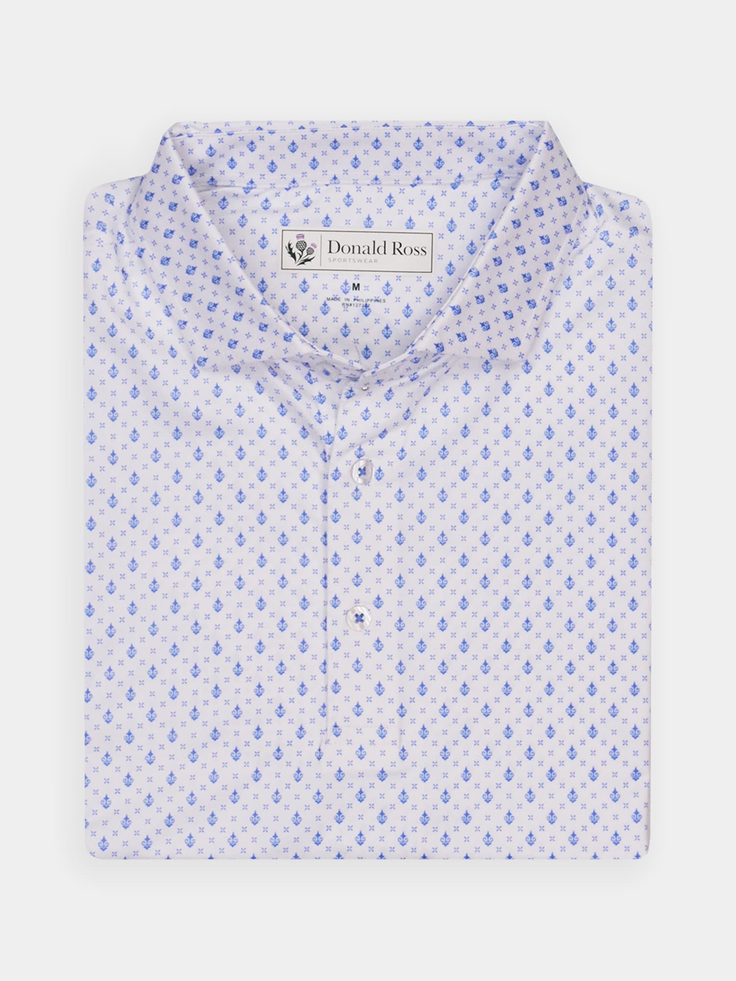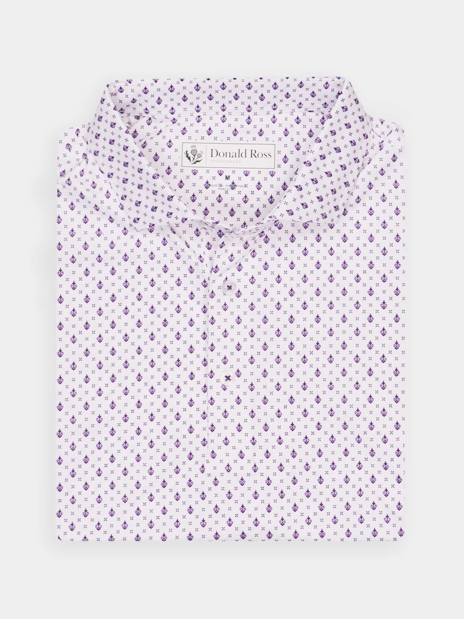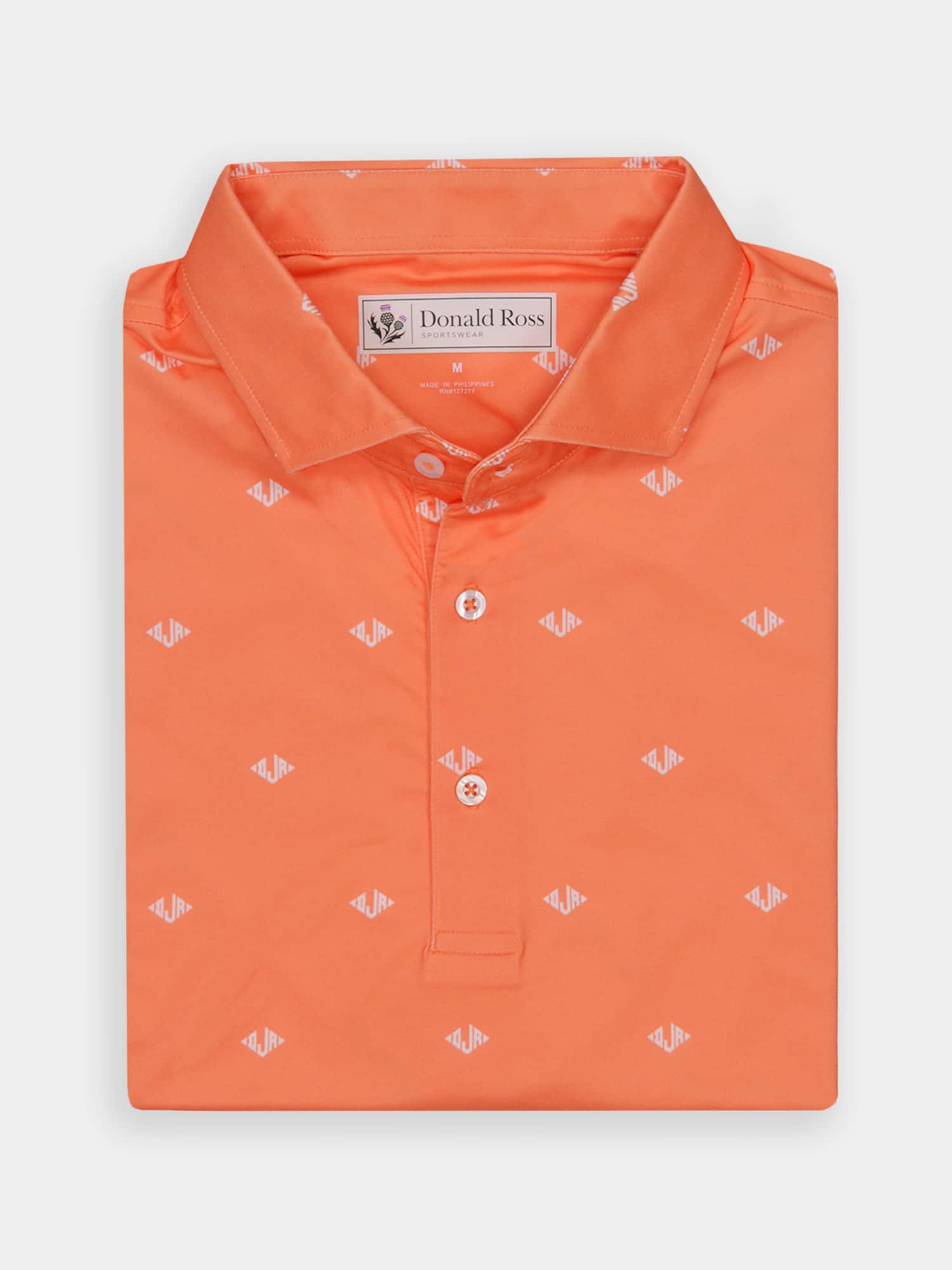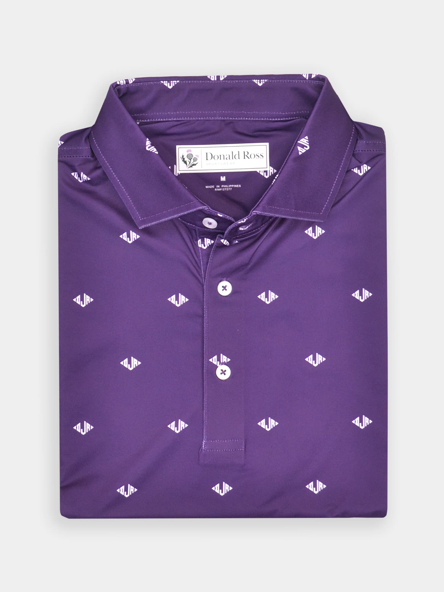 Short sleeve jersey featuring a DJR monogram print with a classic three-button placket and spread collar.