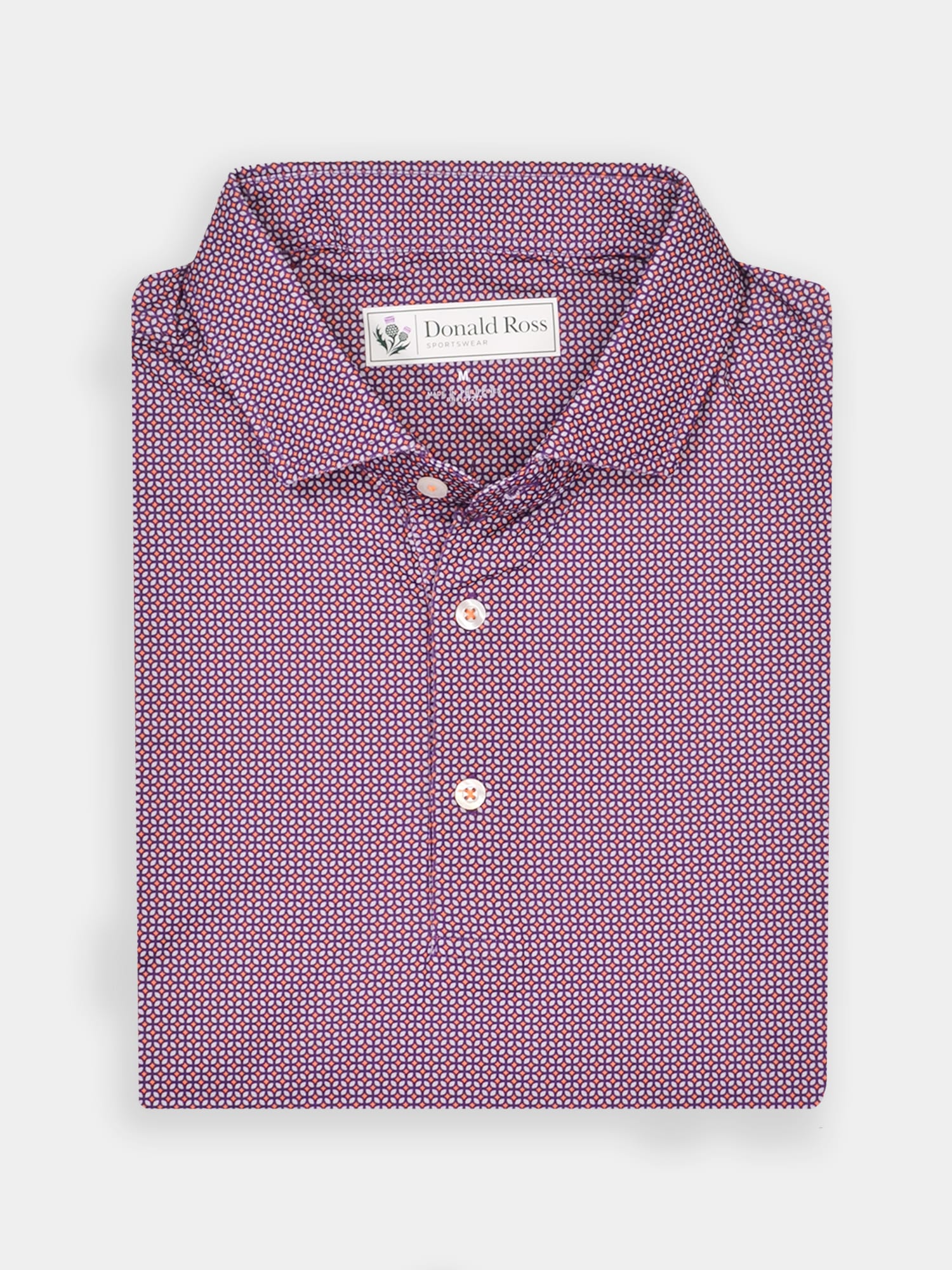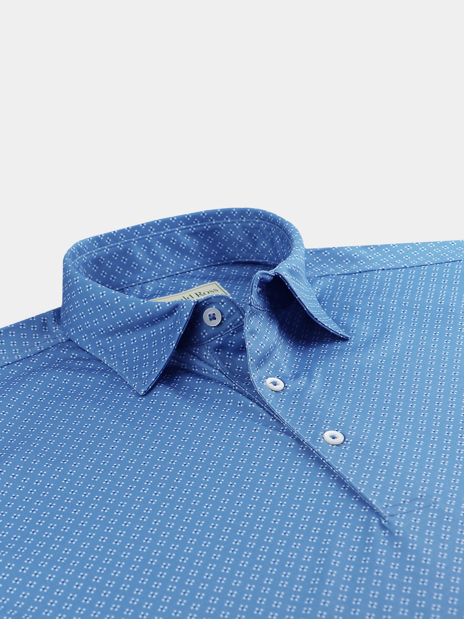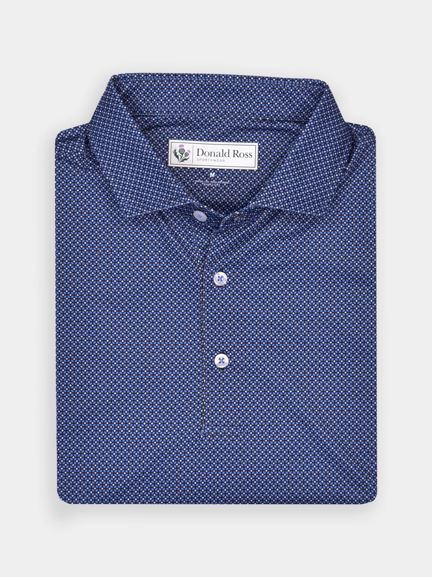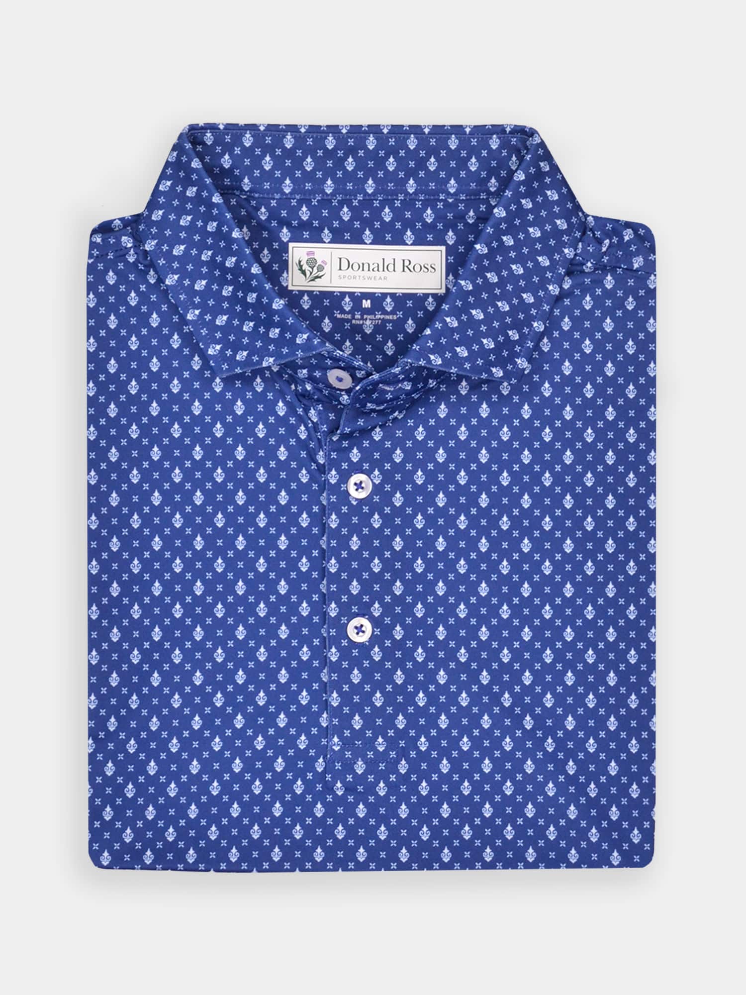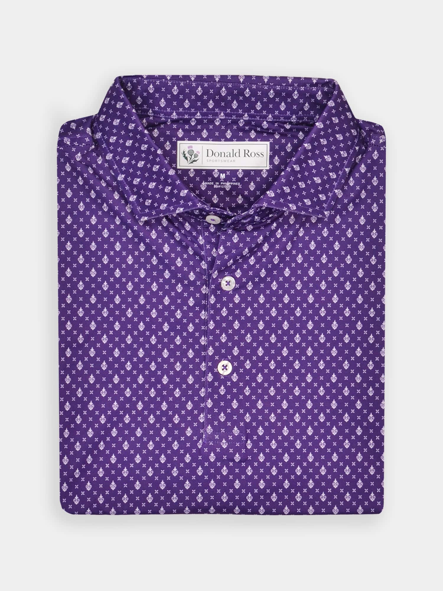 Short sleeve jersey featuring a DJR monogram print with a classic three-button placket and spread collar.
