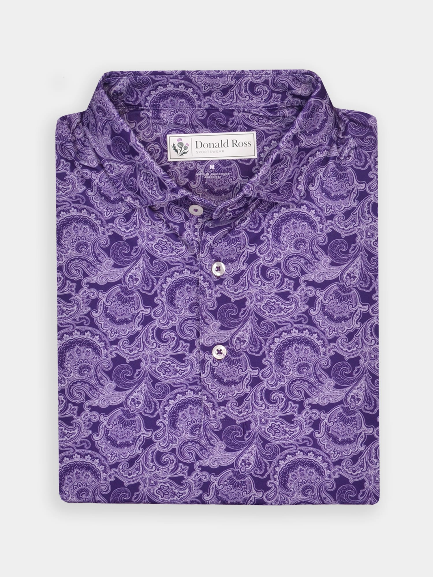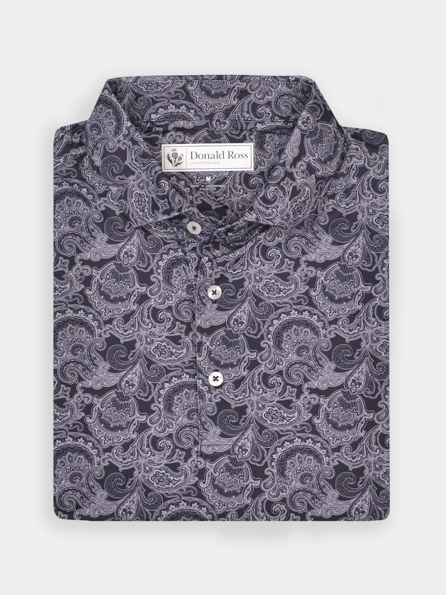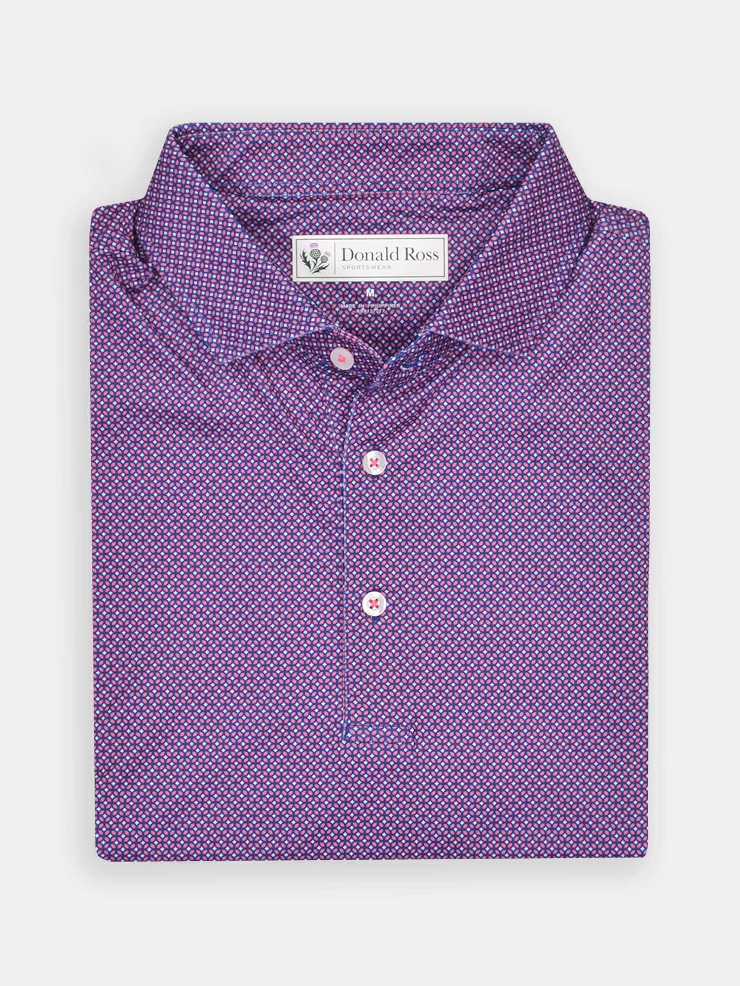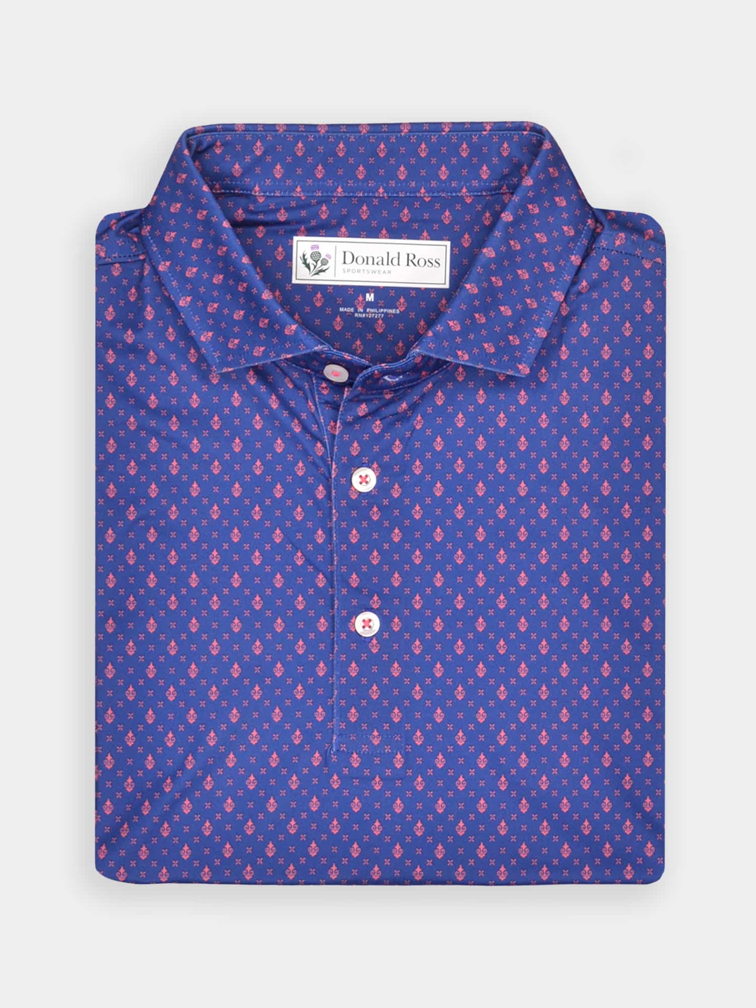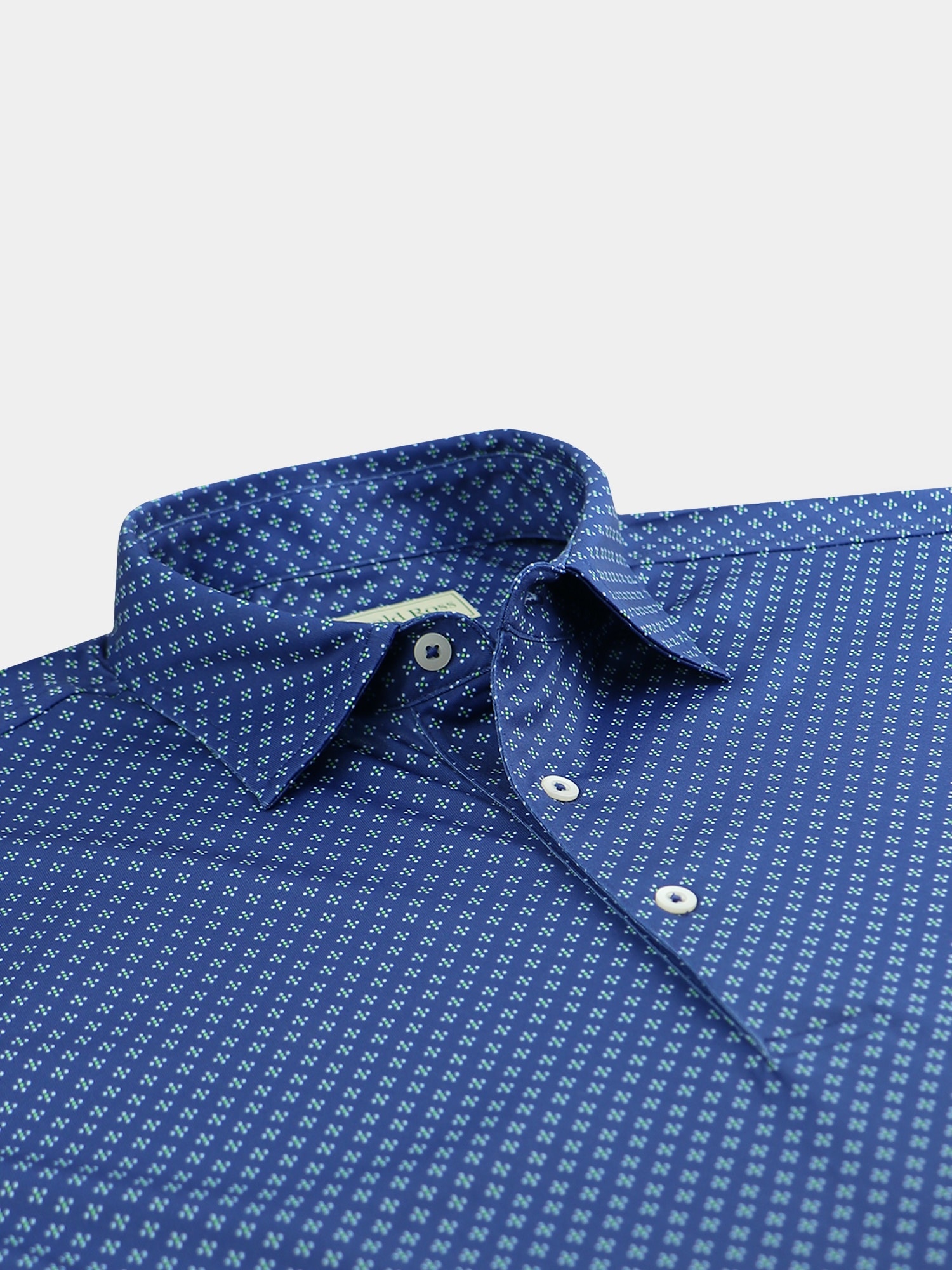 Short sleeve jersey featuring a DJR monogram print with a classic three-button placket and spread collar.