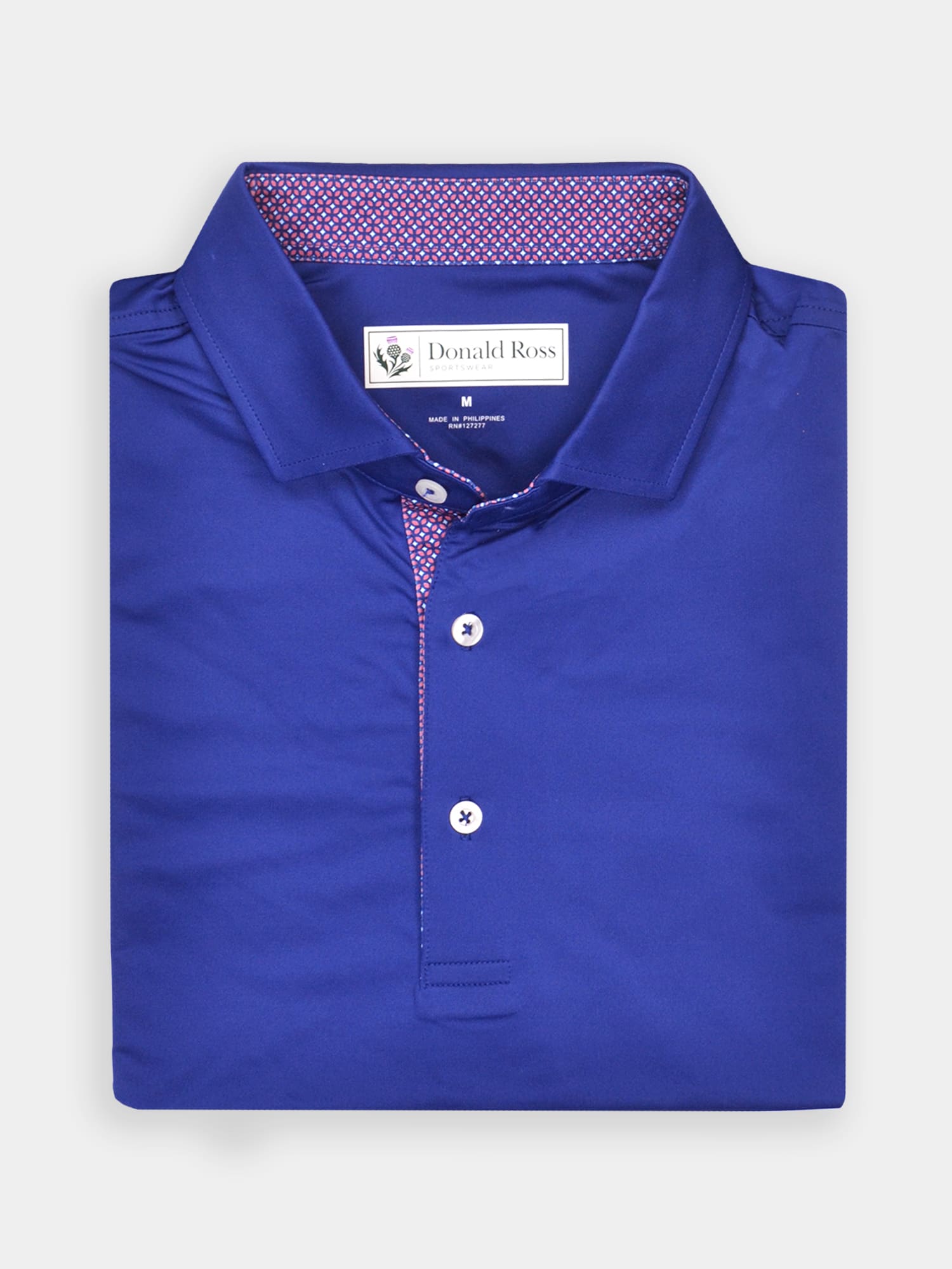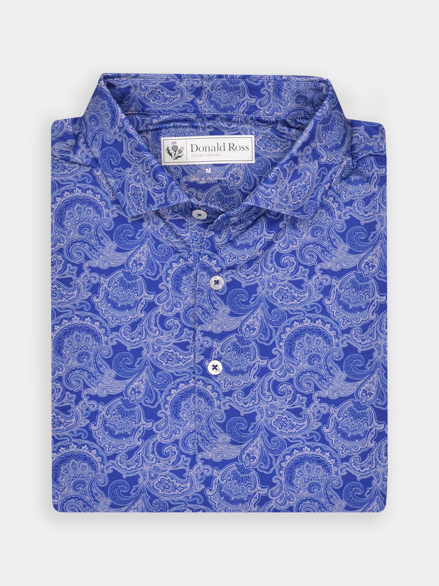 Short sleeve jersey featuring a royalty print with a classic three-button placket and spread collar.