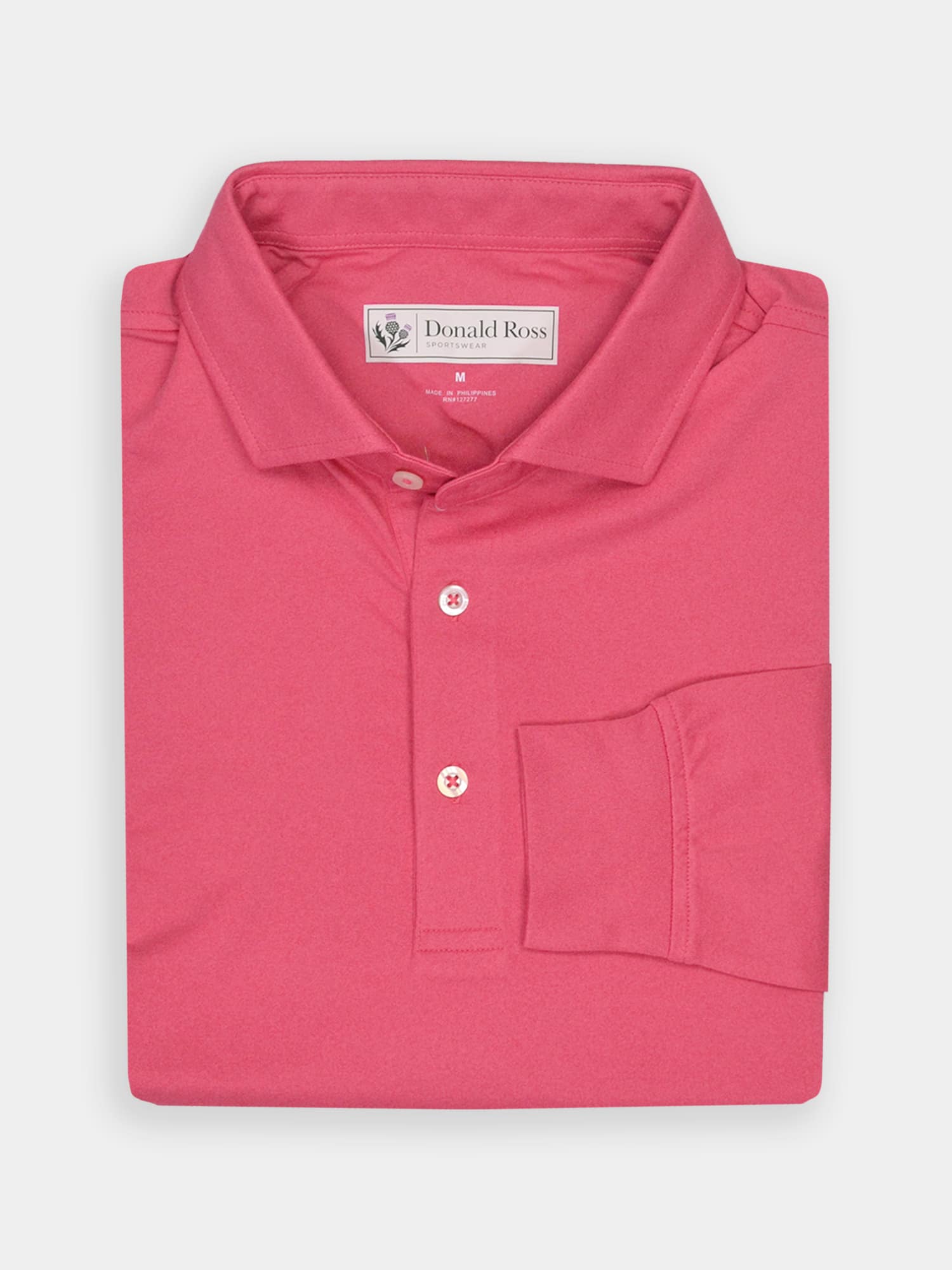Long sleeve solid jersey featuring classic three-button placket, self collar, and ribbed cuffs.