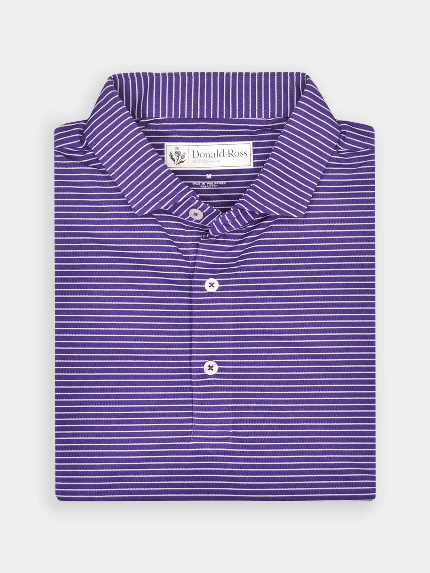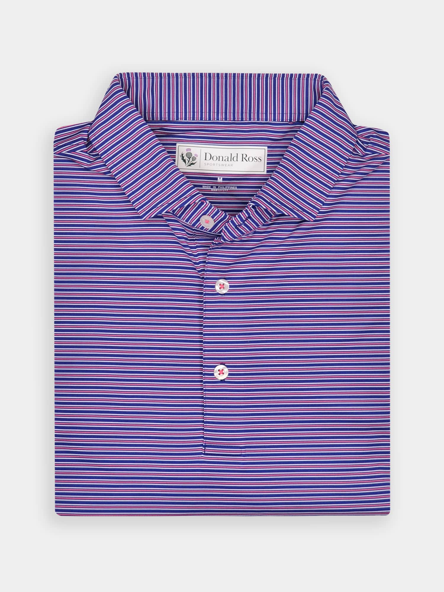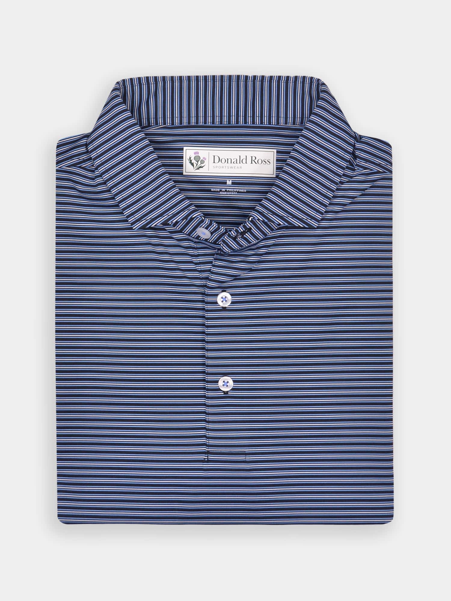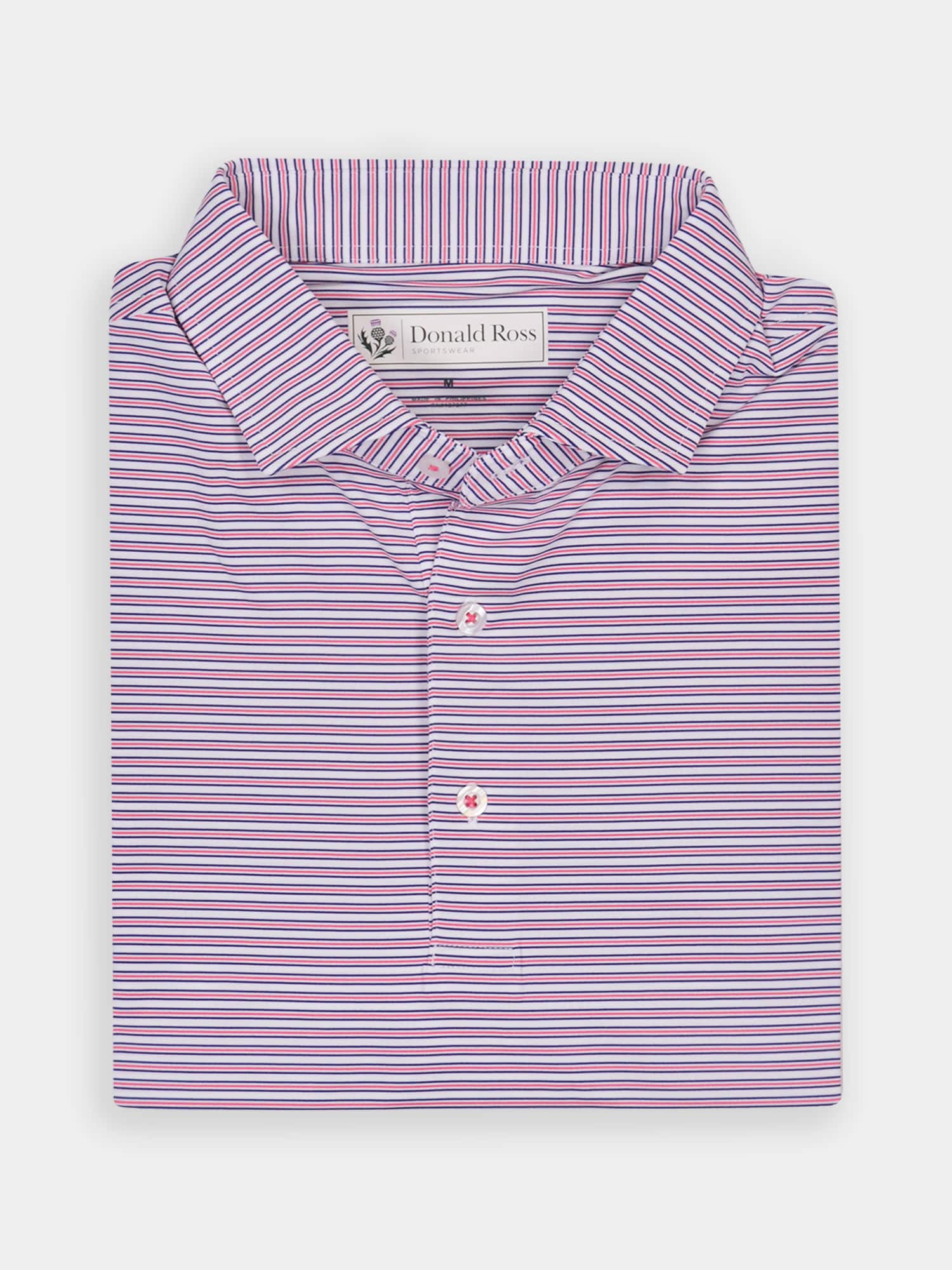 Short sleeve jersey featuring a multi stripe with a classic three-button placket and spread collar.