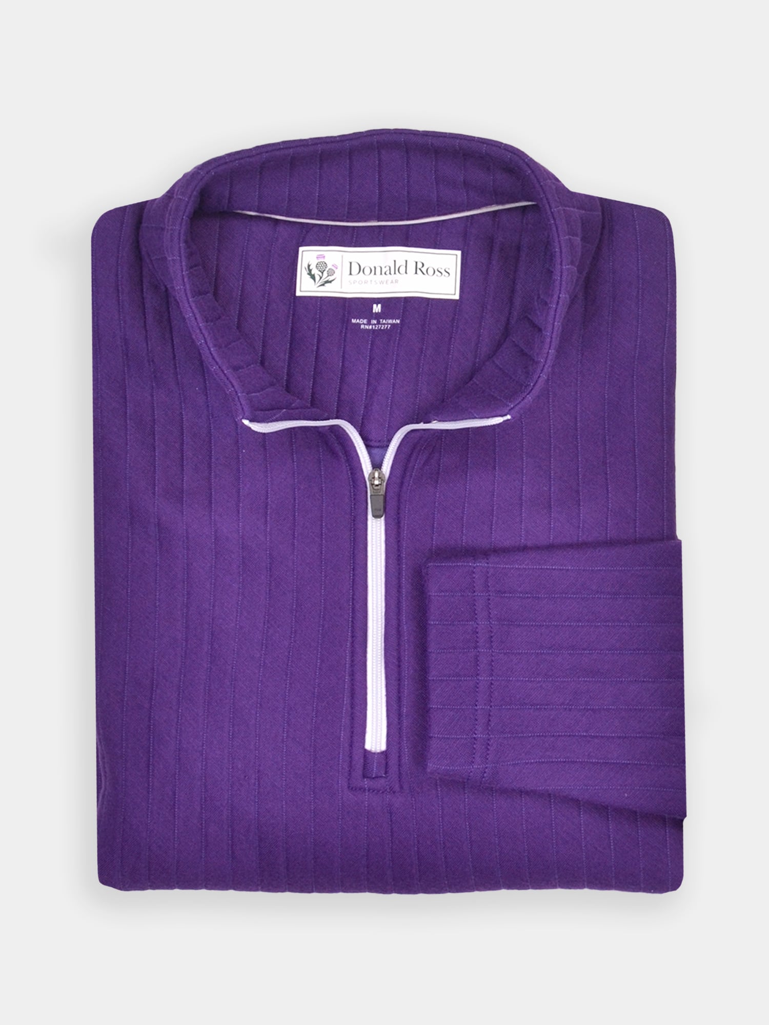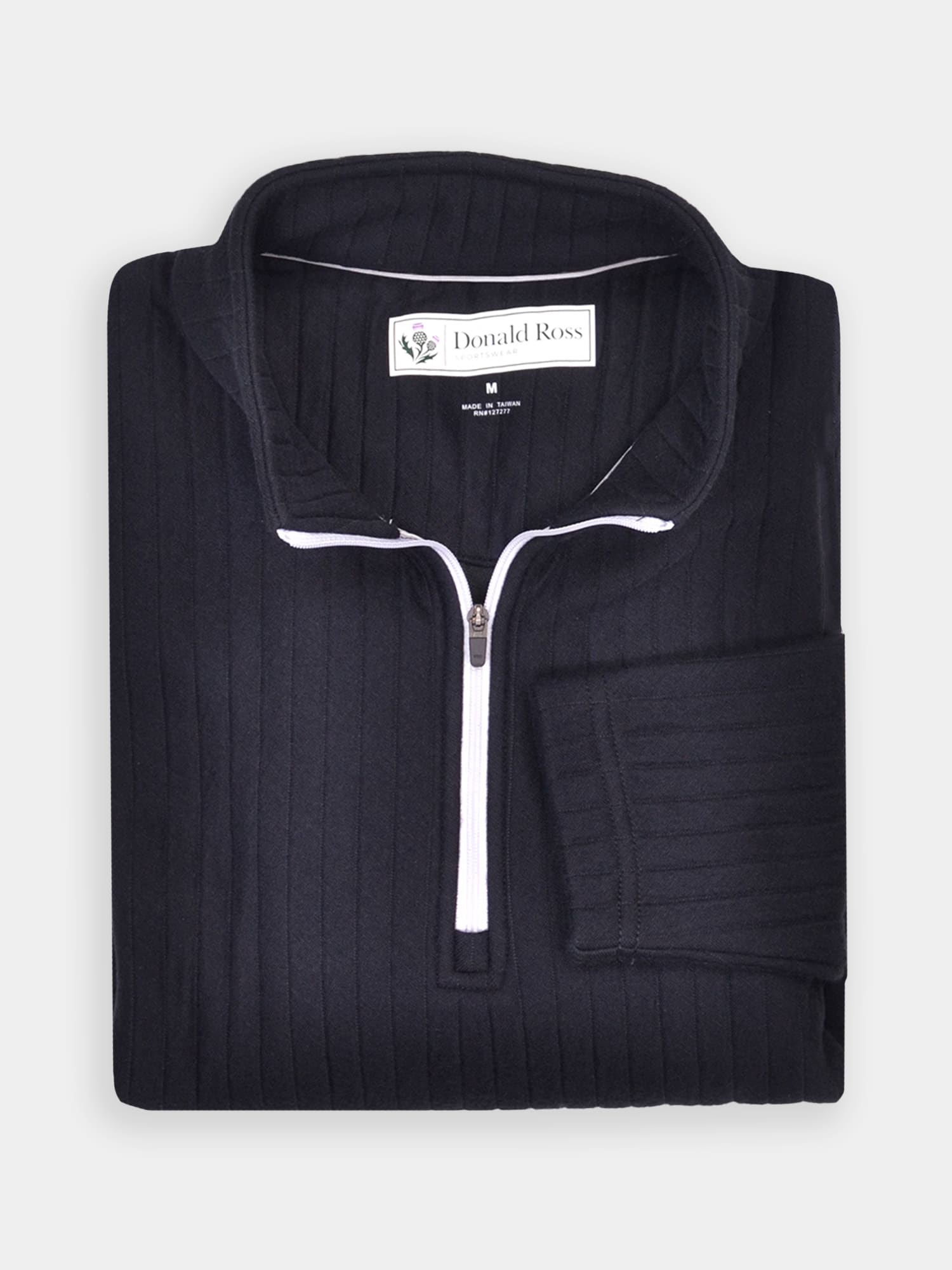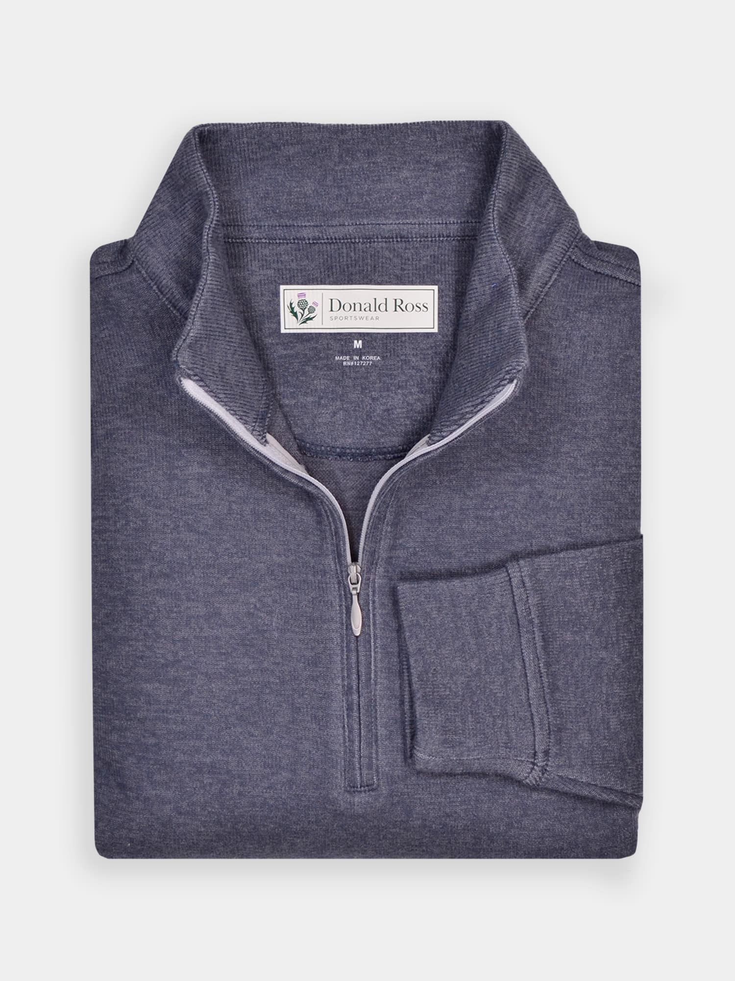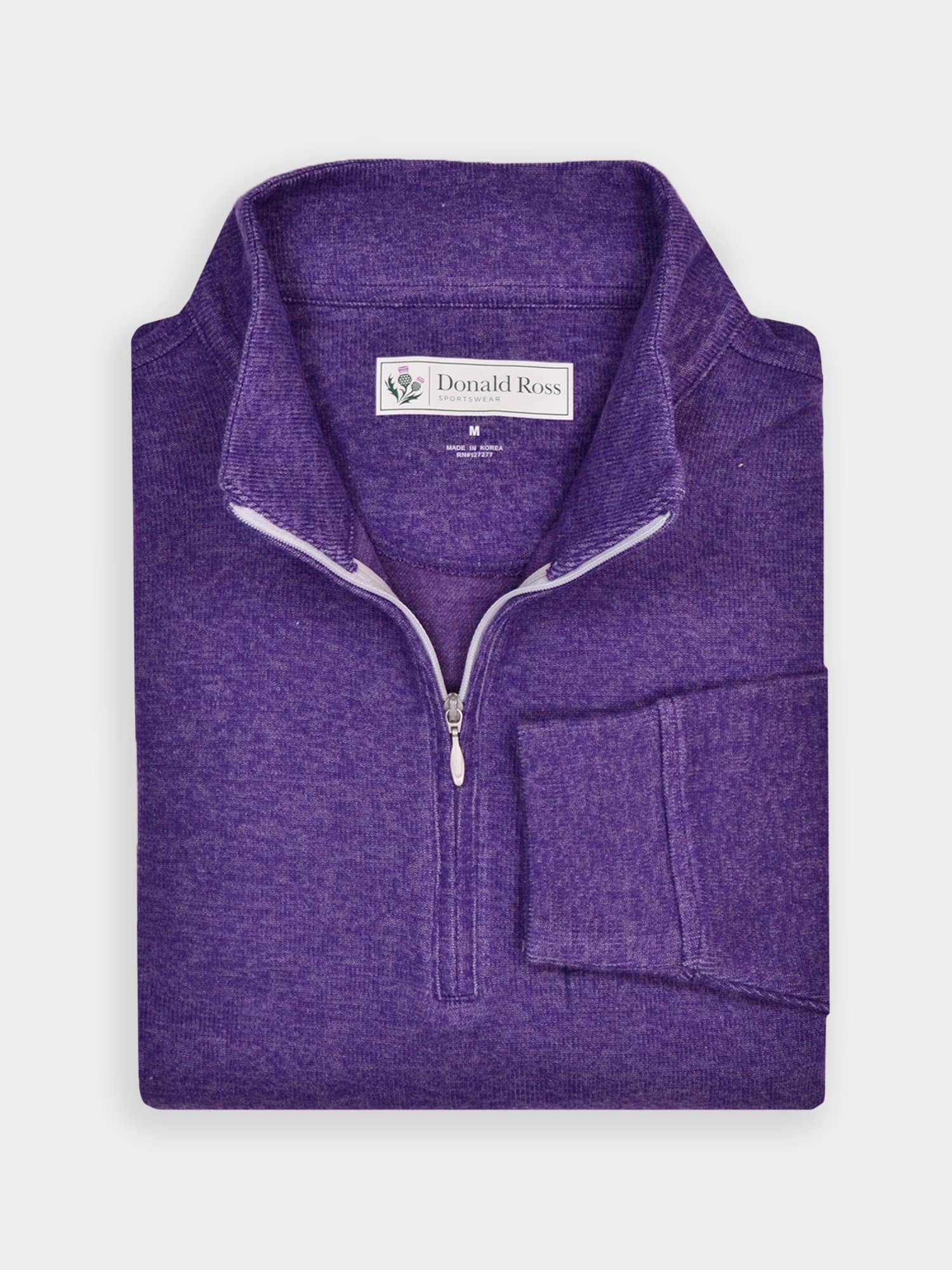 Long sleeve midweight 1/2 zip pullover featuring a drop needle pattern. Model offers ultrasoft fabric fro on and off the course. Model is constructed with banded cuffs and bottom, set-in shoulder construction, and rubber thistle logo on back collar.