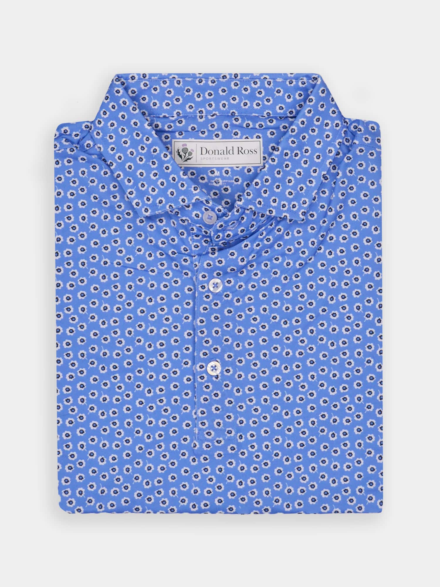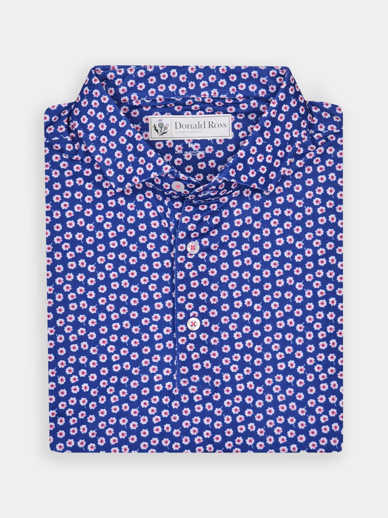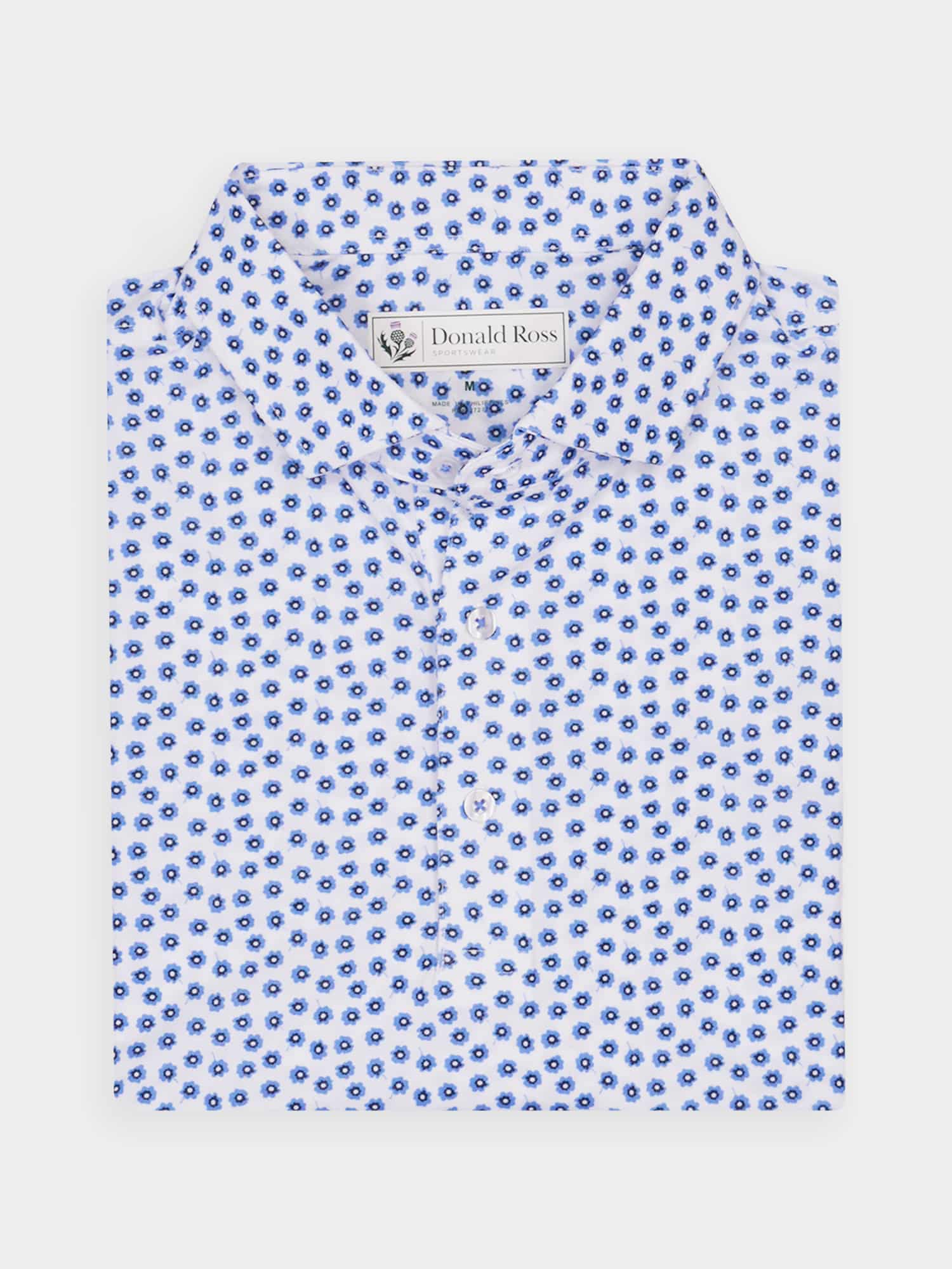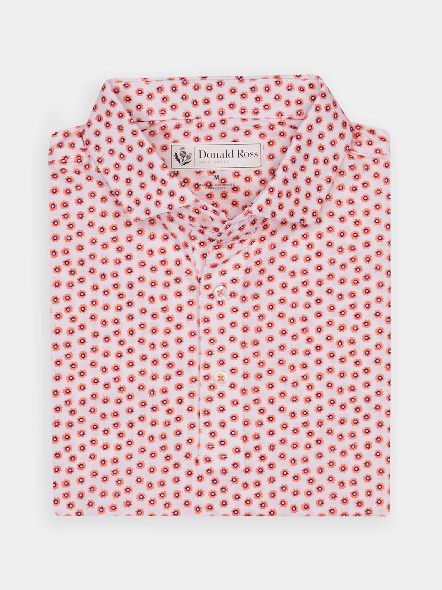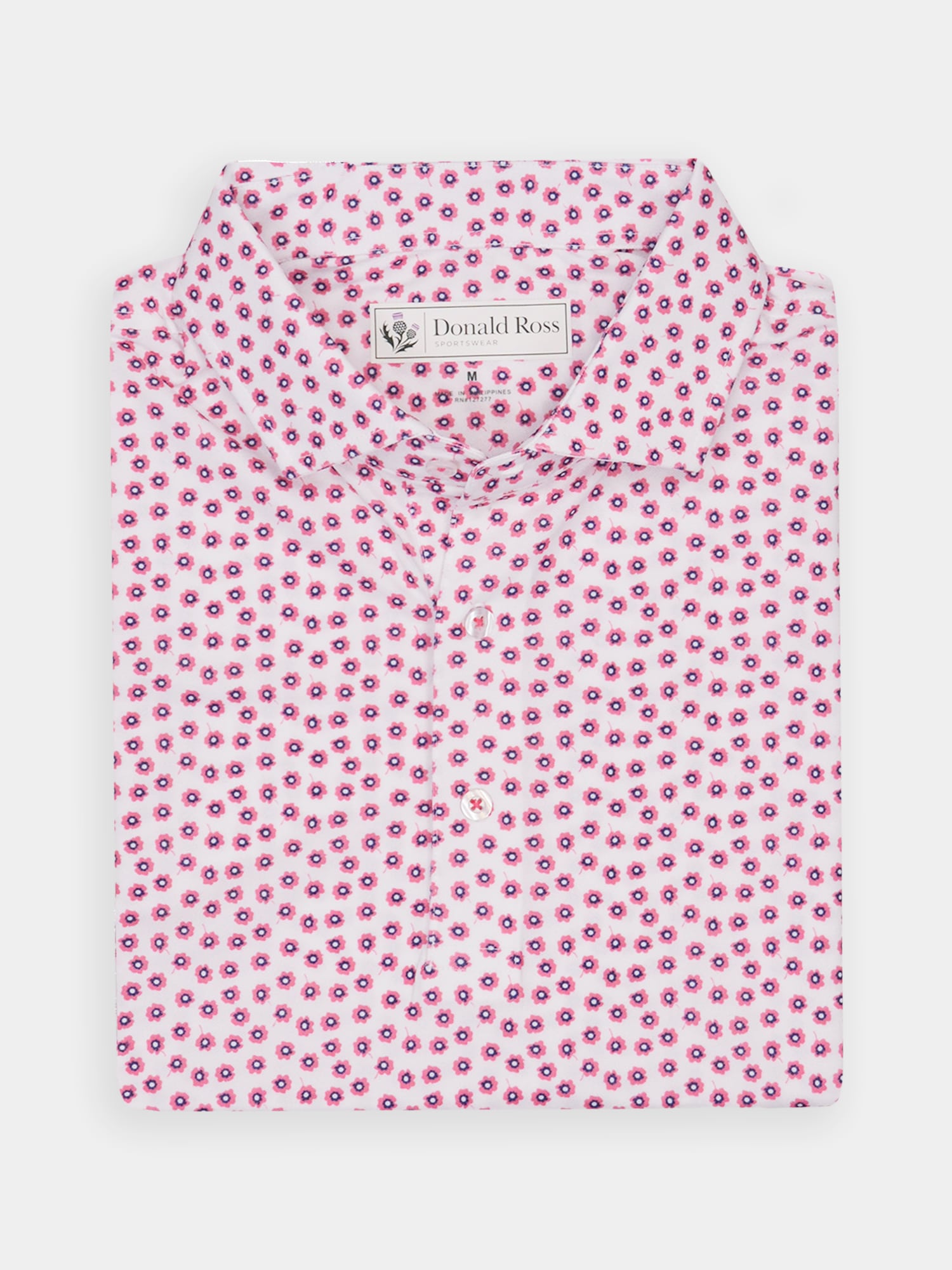 Short sleeve baby pique featuring a peony print with a classic three-button placket and spread collar.