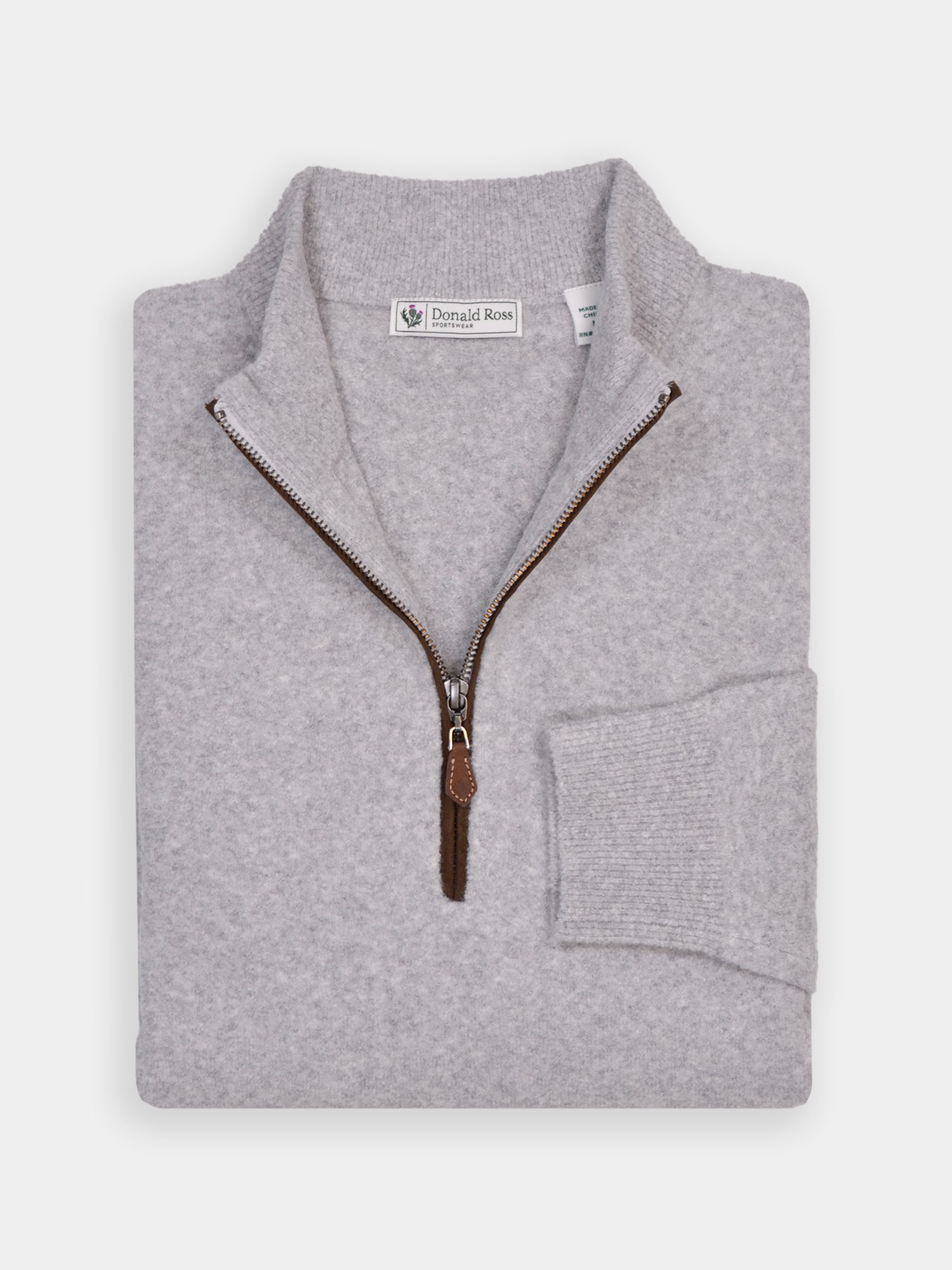 Long sleeve 1/2 boucle sweater constructed with luxurious cotton-cashmere blend. Model offers set-in shoulder construction, suede trim, and banded cuffs and bottom.